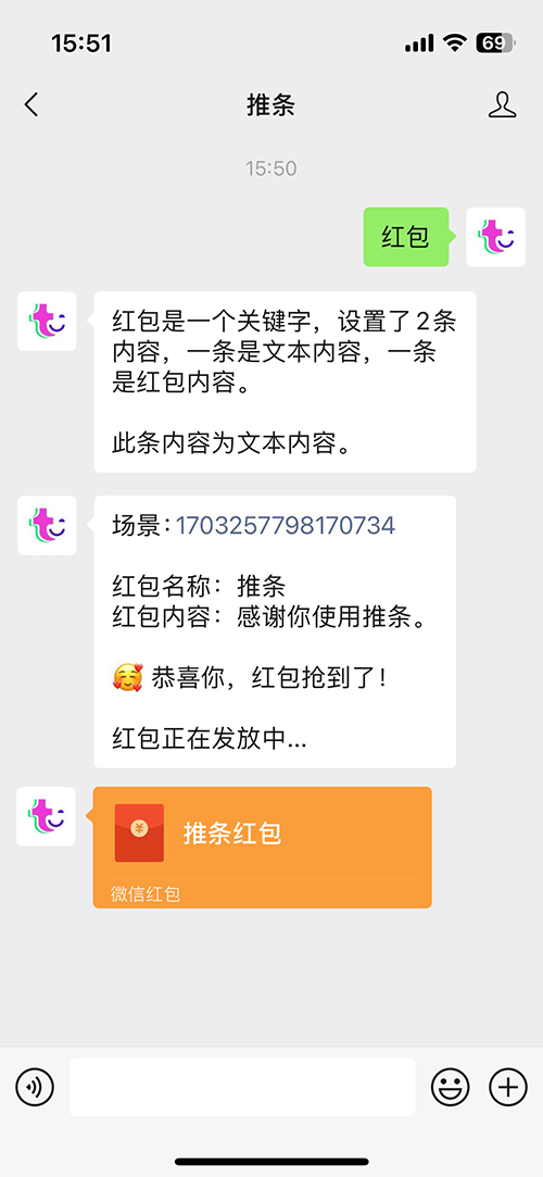 你可以使用推条来构建你的关键字应用,做一些有趣的事情,比如数据查询、执行指令任务、互动游戏、打卡抽奖、智能聊天、发红包、AI图片/语音/视频处理、数据提交,消息通知等。