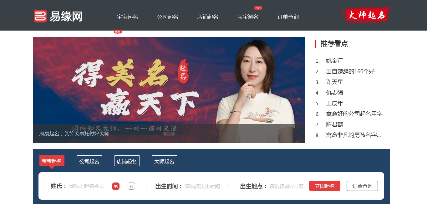 易缘网(www.1quming.cn)隶属于杭州易缘信息科技有限公司旗下品牌,是一个AI智能大数据起名及大师在线起名的双平台。十年来一直以“轻松起好名”为理念不断创新进步。现已成为国内 起名行业的领导品牌,服务满意度在业内名列前茅。公司聘请多位知名周易大师常年担任算法开发顾问,以中国传统文化为基础,结合大数据分析技术 ,耗资千万开发了:AI智能宝宝起名系统、AI测名系统、AI智能公司起名系统、AI智能公司测名系统、AI智能店铺起名系统、AI智能店铺测名系统,并 已取得相关专利及著作权。让用户不懂传统起名知识也能轻松起好名。同时平台还有大师在线服务,满足用户的各种需求。