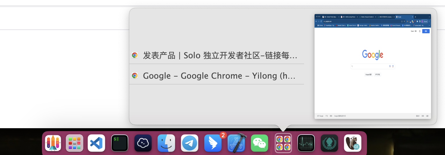 本人现在从事的前端远程开发,在日常的开发过程中,我经常需要开多个chrome窗口,多个vscode 窗口,而mac的原生Dock在多窗口之间进行切换的效率实在太低下,无奈之下,我只好自己开发,从立项到现在,开发了10个月。经过一两个月的公测,也积累不了一些用户,时常会给我带来反馈与提出新的feature。