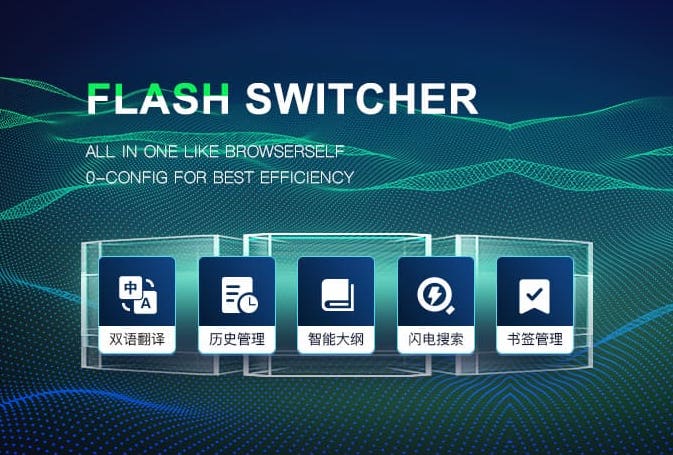 Flash Switcher 闪记 是一款提高浏览器操作效率和体验的工具,专注于使用频率最高的ChatGPT、网页翻译、万级书签管理、网页大纲、多Tab切换等功能,基于【约定大于配置】和【语义化快捷键】等提效思想,在保证每个功能的简单易用的同时,最大化提高操作效率。