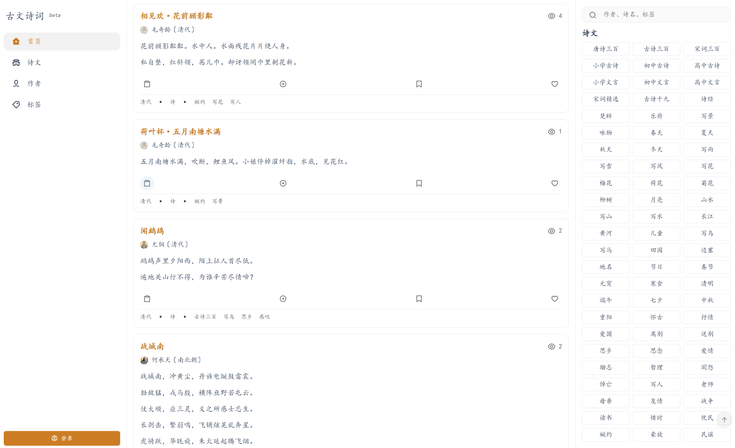 网站简介:古文诗词作为传承经典的网站专注于古诗文服务,致力于让古诗文爱好者更便捷地发表及获取古诗文相关资料。