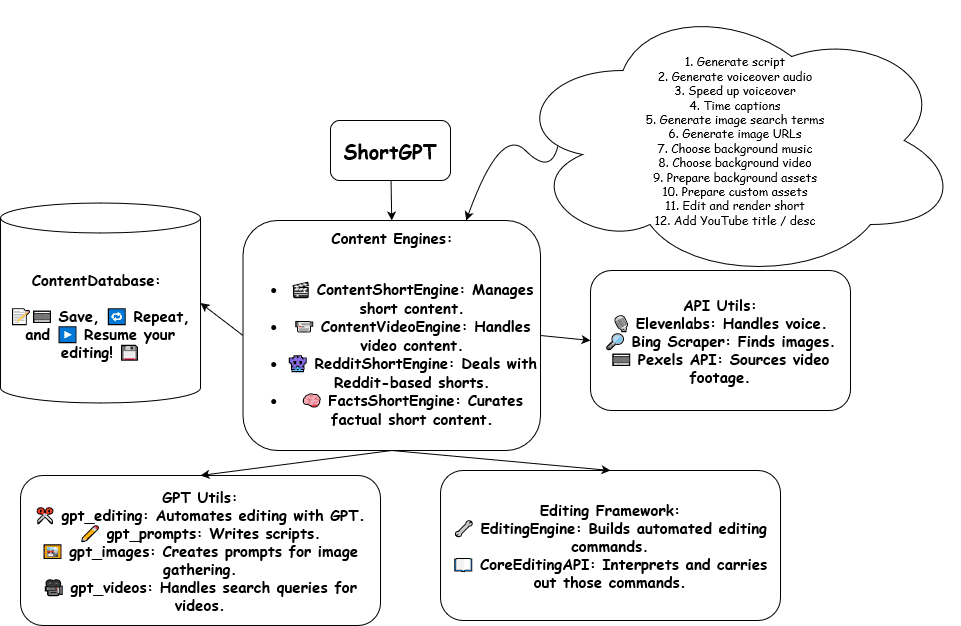 ShortGPT 可以处理大多数典型的视频相关任务,例如编写视频脚本、生成画外音、选择背景音乐、编写标题和描述,甚至编辑视频。无论使用哪个平台,该工具都适用于短视频内容和长视频内容。