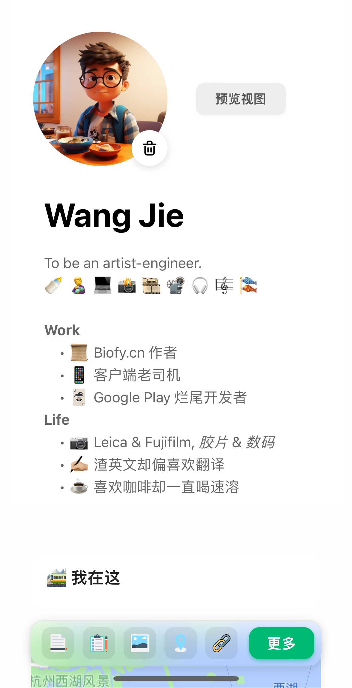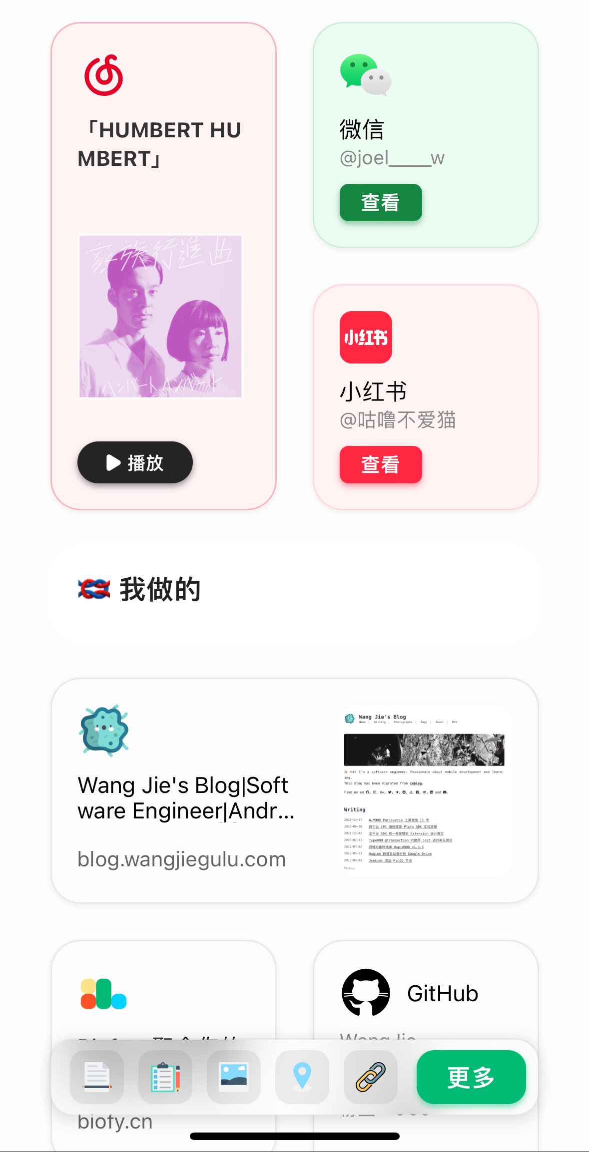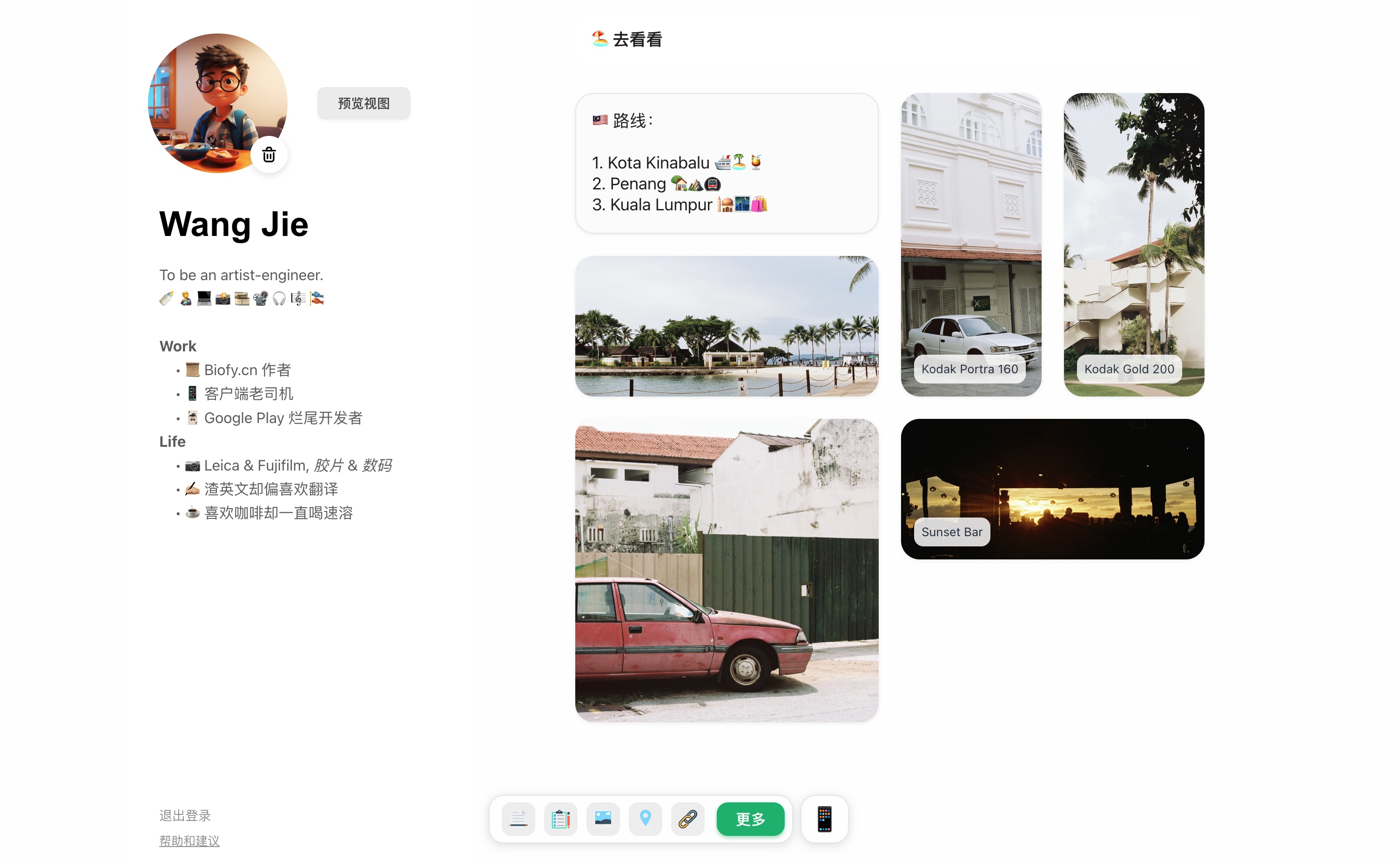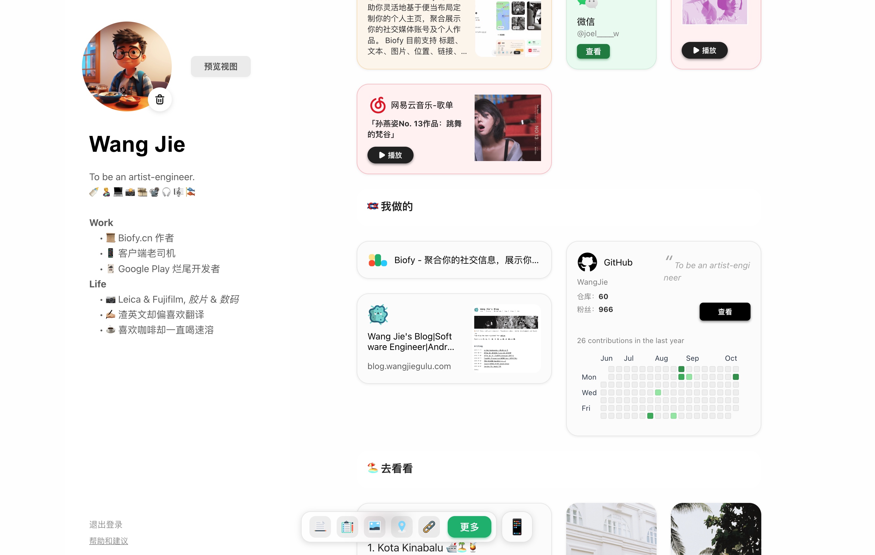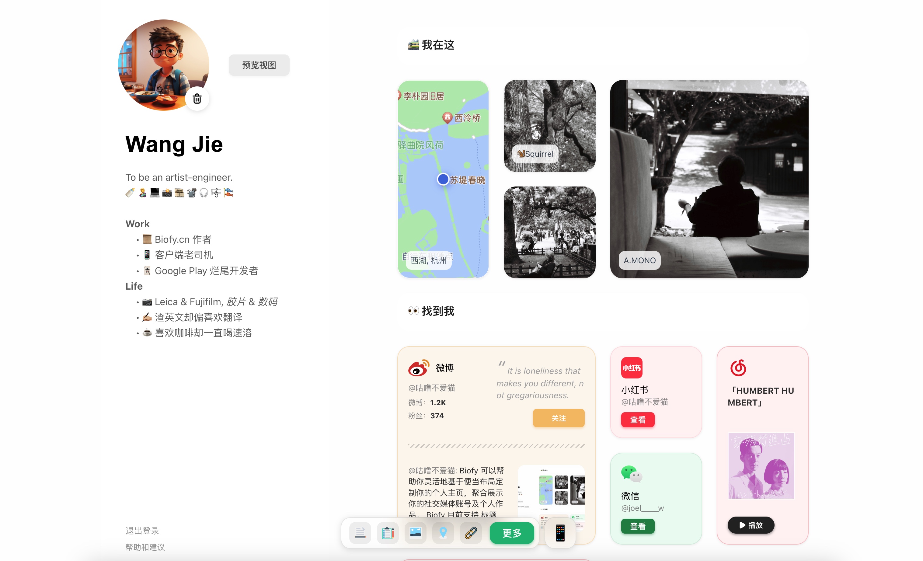 产品功能:支持通过 Block 来定制化个人主页,Biofy 目前支持 标题、文本、图片、位置、链接、小红书、微信、微博、Github、网易云音乐 等不同的 Block 组件(组件类型还在持续扩展中),支持 PC 和手机网页。针对各个类型的组件,支持多种经典的 “便当布局“,使得布局的组合变得更加灵活多样。