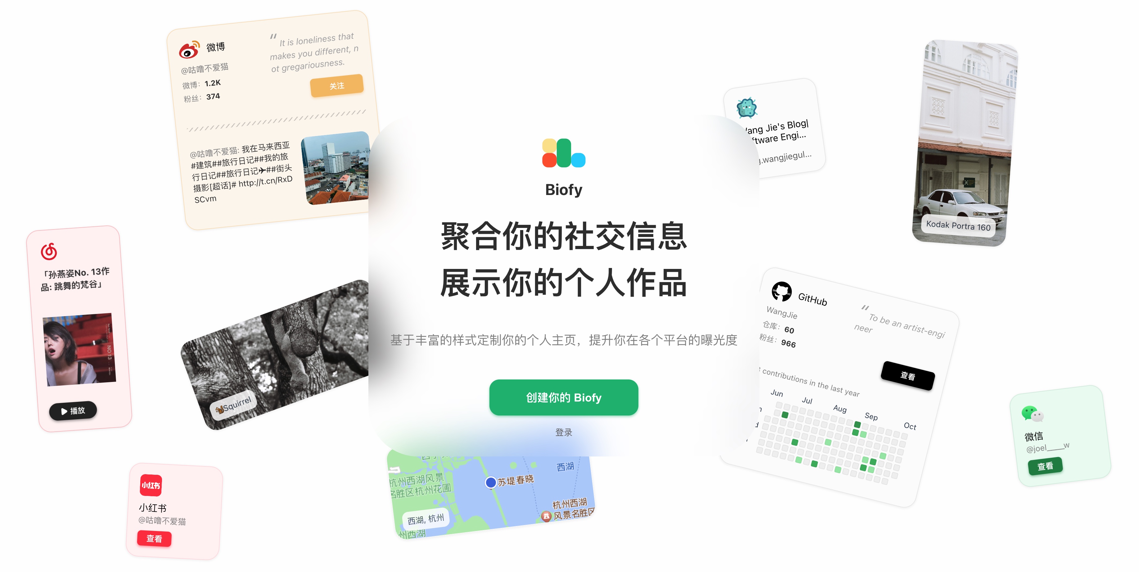 简介:Biofy 可以帮助你简单、灵活地定制你的个人主页,帮助你聚合各个社交媒体账号、博客、链接,展示你的个人作品,提升你在各个平台的曝光度。