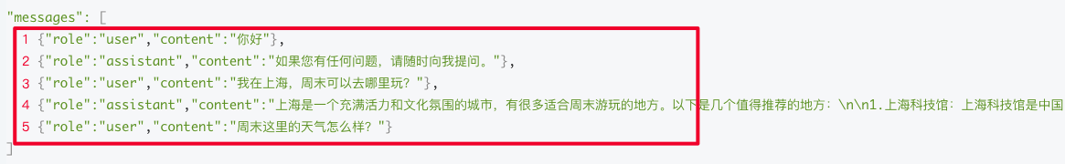 1.以下列为例介绍Messages使用"messages": [ {"role":"user","content":"你好"}, {"role":"assistant","content":"如果您有任何问题,请随时向我提问。"}, {"role":"user","content": "我在上海,周末可以去哪里玩?"}, {"role":"assistant","content": "上海是一个充满活力和文化氛围的城市,有很多适合周末游玩的地方。以下是几个值得推荐的地方:\n\n1. 上海科技馆:上海科技馆是中国大陆最大的科技馆之一,有许多互动展览和科学实验室,可以让您了解科技的发展历史和最新成果。\n2. 上海博物馆:上海博物馆是一座集艺术、历史和文化于一体的博物馆,有许多精美的艺术品和文物,可以让您深入了解中国和世界的文化历史。"}, {"role":"user","content": "周末这里的天气怎么样?"} ] }