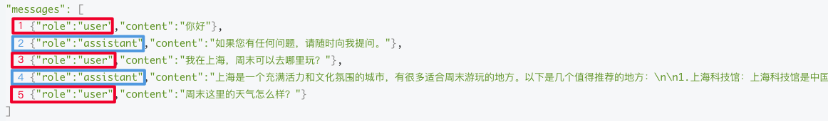 奇数位(红框)message中的role值为user,即第1,3,5个message中的role值为user