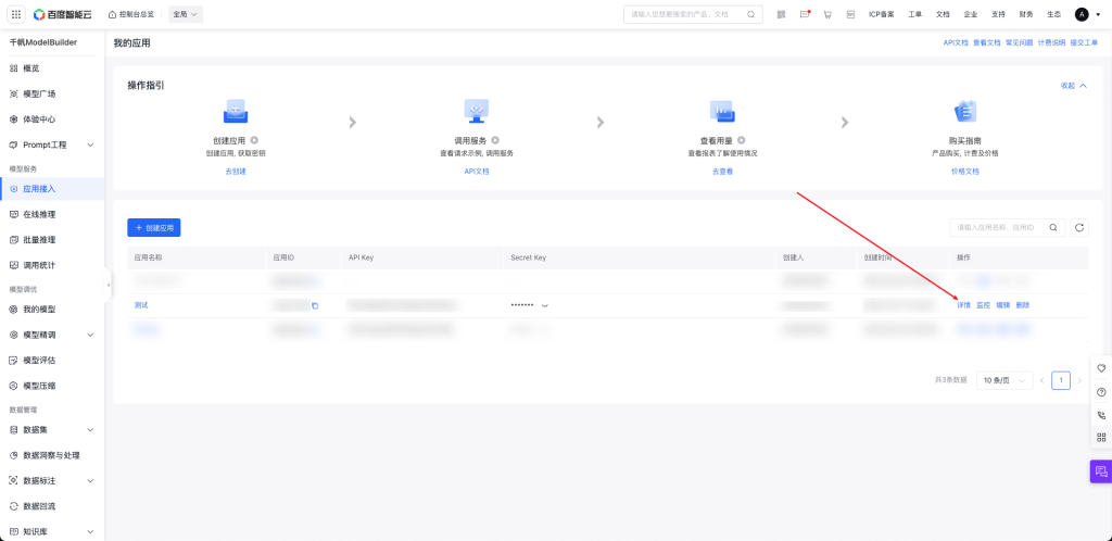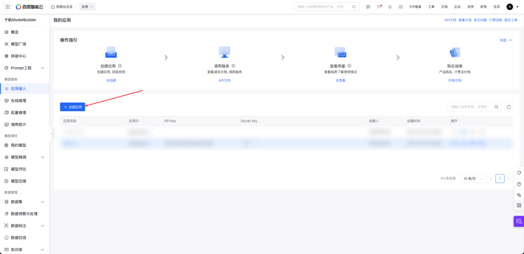 2.进入千帆ModelBuilder点击左侧的应用接入并且点击创建应用