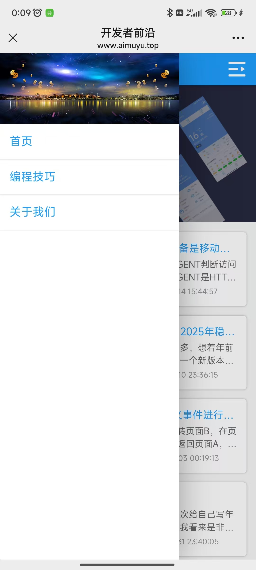 点击右上角的菜单按钮会弹出一个菜单列表。其实我个人还是很喜欢这种抽屉式的设计风格。本来手机的界面就小,网站的分类栏目比较多时候这是一种非常棒棒的解决方案。也给大家展示一下弹出后的UI界面。