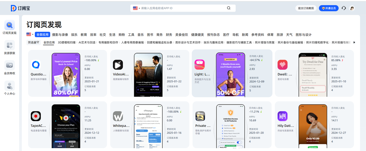 如果你正在开发或优化特定类型的应用(如健身、教育、生产力等),订阅宝可以为你提供相关市场的最新动态和趋势分析。你可以了解该类型应用的普遍定价、订阅模式和用户偏好,从而更有针对性地调整订阅策略。