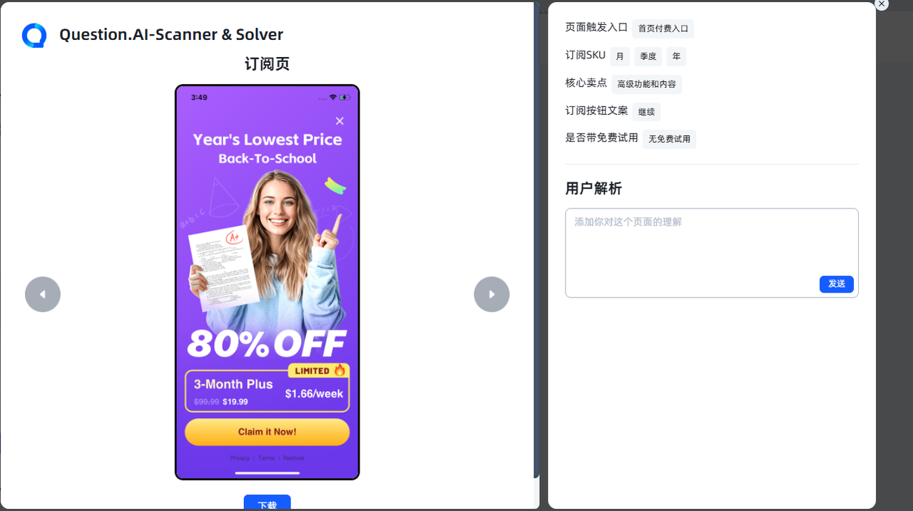 订阅宝还提供对竞品引导页和页面设计的深入分析。通过查看其他成功应用的用户引导策略,你可以获得灵感并优化自己的用户体验。订阅宝的设计分析功能帮助你识别最佳实践,从而提高用户转化率和留存率。