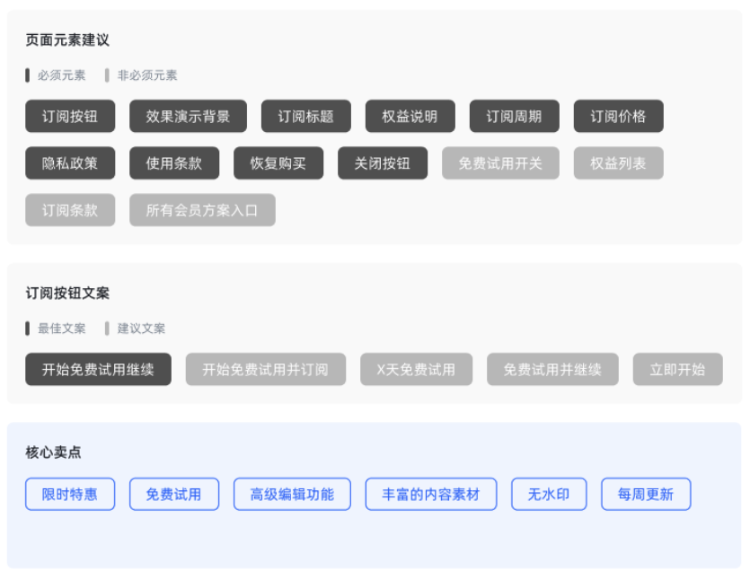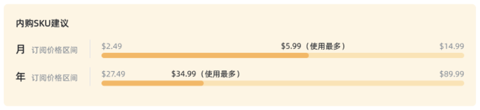 “订阅宝”的订阅建议报告模块中,我们非常细致的把竞品在订阅页面上需要设计的元素,按钮用到的文案,权益表达的文案等等全都给大家做了建议,针对同品类产品,在报告的加持下,可以最大程度的帮你提升收入。