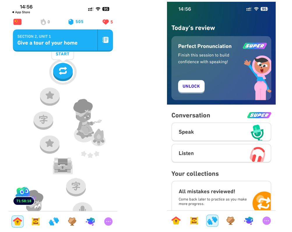 - 内置学习反馈:应用内实时反馈机制是 Duolingo 的一大特色,用户在学习过程中可以收到即时的进度报告和个性化建议。例如,系统会根据用户的学习进度提供改进建议,帮助用户保持学习动力。