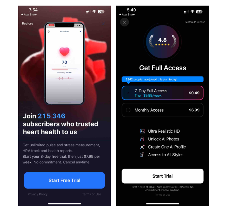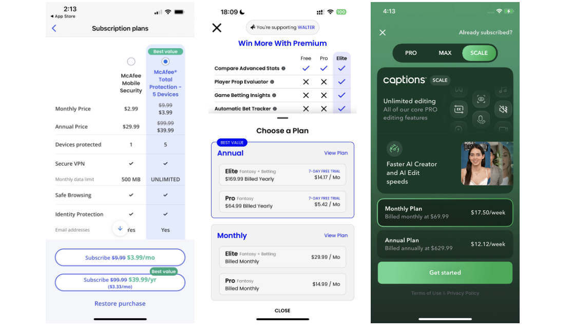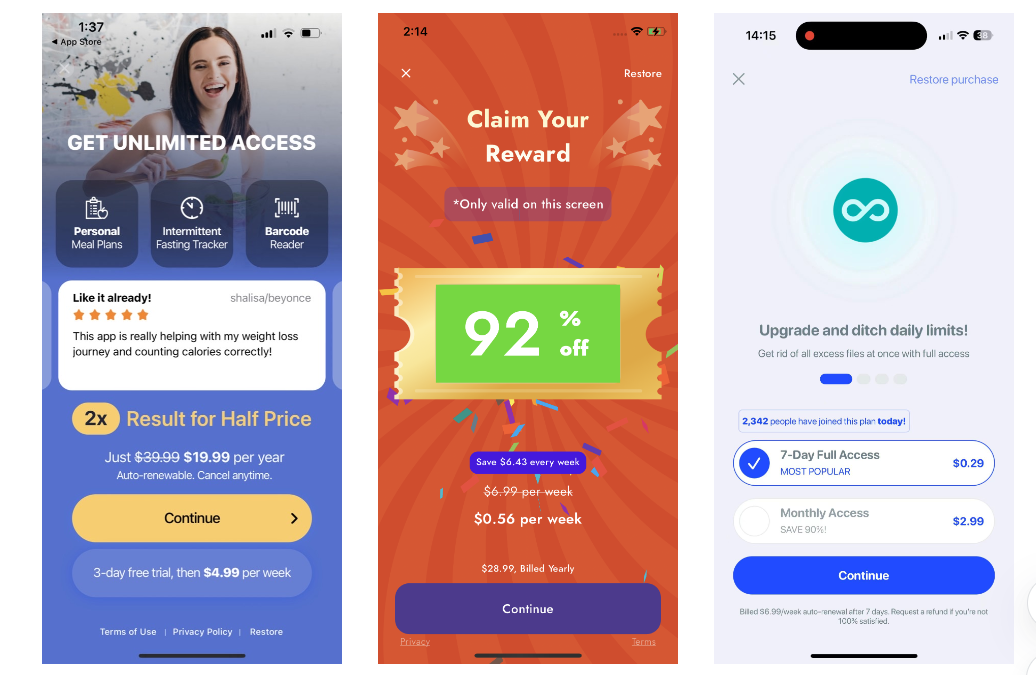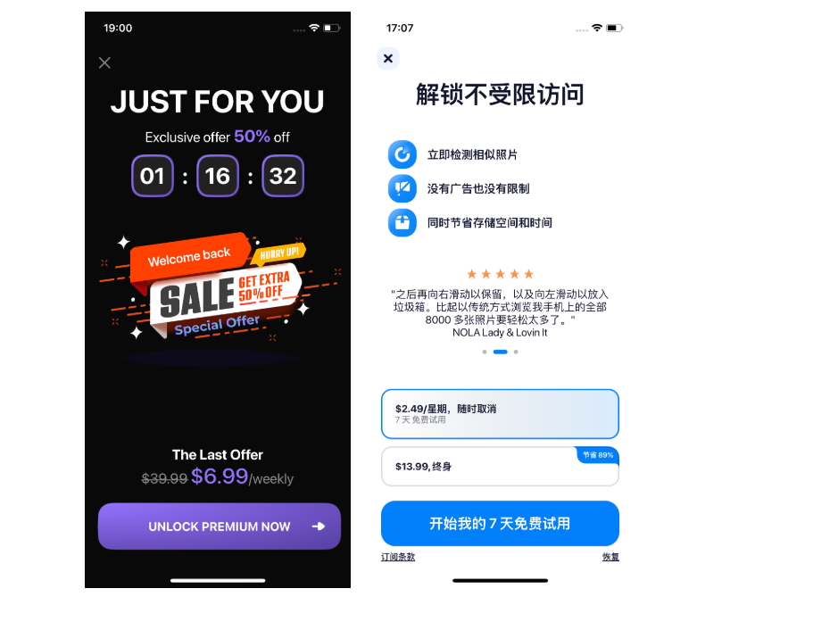 - 原价9.99➔显示"全年仅9.99➔显示"全年仅49(立省$70)" + 倒计时压力