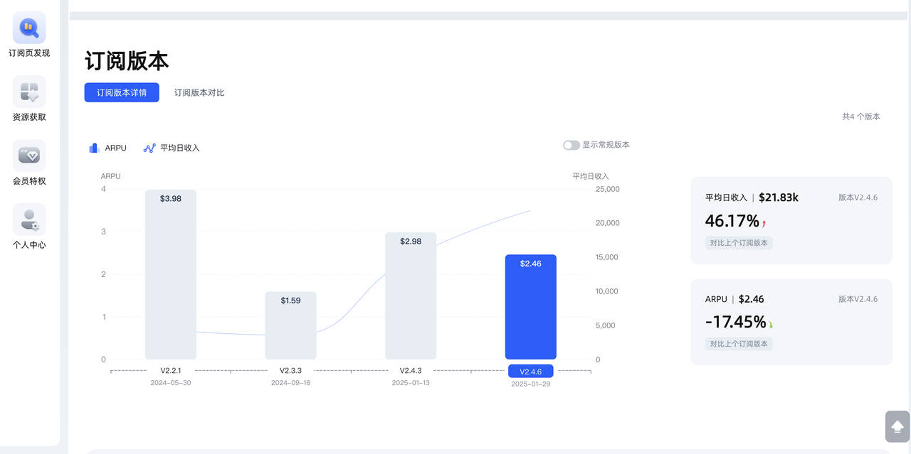 - 对比不同版本的ARPU值变化曲线 — 精确分析哪些变动带来了收入的提升。