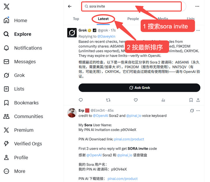 在Discord、X(Twitter)等平台的官方或相关社群中,有时会有用户分享邀请码,不过邀请码时效极短,很容易被使用,手速一定要快!你也可以用Grok联网去搜索。