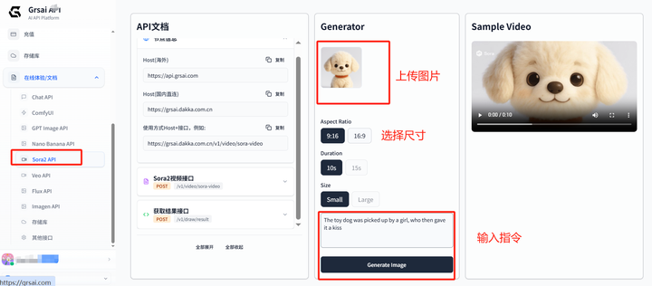 进入官网控制台,点击左侧栏目在线体验/文档,选择sora 2 API,右侧可上传图片,输入指令。每次生成会需消耗对应分。