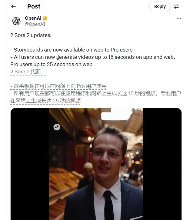 Sora 2的故事板:Sora 2为Pro用户提供了一个名为 “故事板” 的强大功能。这个功能允许创作者以秒为单位精确控制每个镜头,包括自定义镜头切换时间、画面运动轨迹和视觉效果,和导演一样规划叙事节奏。