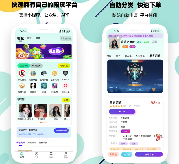 订单与支付:集成微信支付/支付宝,支持预约下单、分佣结算、陪玩师提现。