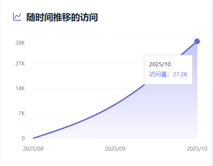 GrsAi APi 是在2025年4月13日上线,通过朋友介绍获得了一个大客户,就开始专注于这个Api产品。运营了大半年从最开始的几百访问量,到8k九月的9.49k,10月甚至达到了27.2k,这意味着,在刚刚过去的一个月里,我的个人项目 GrsAi API平台(https://grsai.com/)访问量实现了近三倍的暴涨。