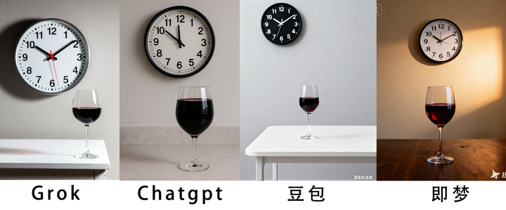 精准的时间概念:由于商业产品摄影的标准,时间通常默认10:10这也导致许多图像模型不能在时钟上显示正确的时间。当你要求Nano Banana 2(GemPix 2)生成“11:15 on the clock and a wine glass filled to the top”时,它能精确计算时针与分针的位置关系,给出一个在物理上正确的时间显示。正是模型内部构建了关于时间流逝和钟表运作机制的抽象模型,顺利通过时钟和装满杯红酒测试。