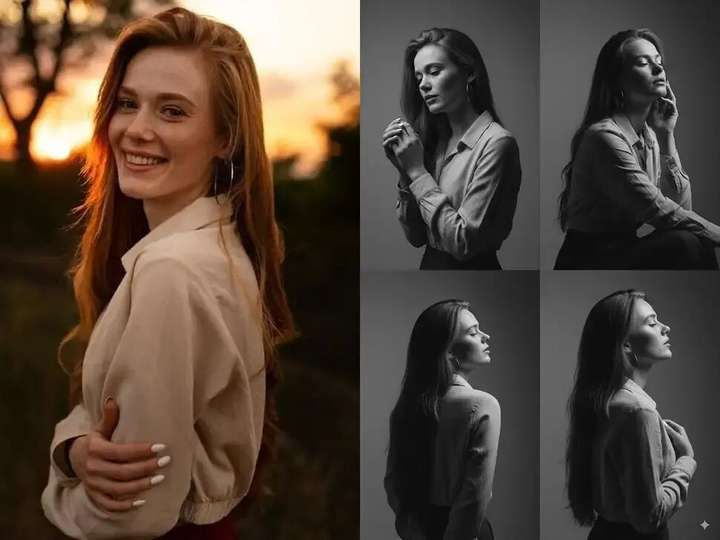 提示词:将这张彩色照片转换为一张高清的艺术黑白肖像。背景需处理成柔和的渐变灰,以突出人物。为画面增加精美的胶片颗粒本身。人物姿势应自然,仿佛在沉思,光线方向性,重点勾勒面部造型,营造神秘感。要求没有背景的背景,每张照片换不同的动作。生成4张。