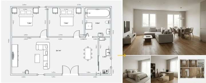 提示词:根据上传的二维平面图,生成一张专业的室内设计展示图。布局:最终图像应为拼贴画,顶部为一张主图,下方为若干张小图。各图内容:1. 主图(顶部):主要起居空间的广角透视图,展示起居室与餐厅之间的连接。2. 小图(左下):主卧室视图,重点展示床和窗户。3. 小图(中下):家庭办公室/书房视图。4. 小图(右下):3D俯视图,展示家具布局。整体风格:所有图像均采用统一的现代简约风格,搭配温暖的橡木地板和米白色墙面。质量:照片级渲染,柔和的自然光。