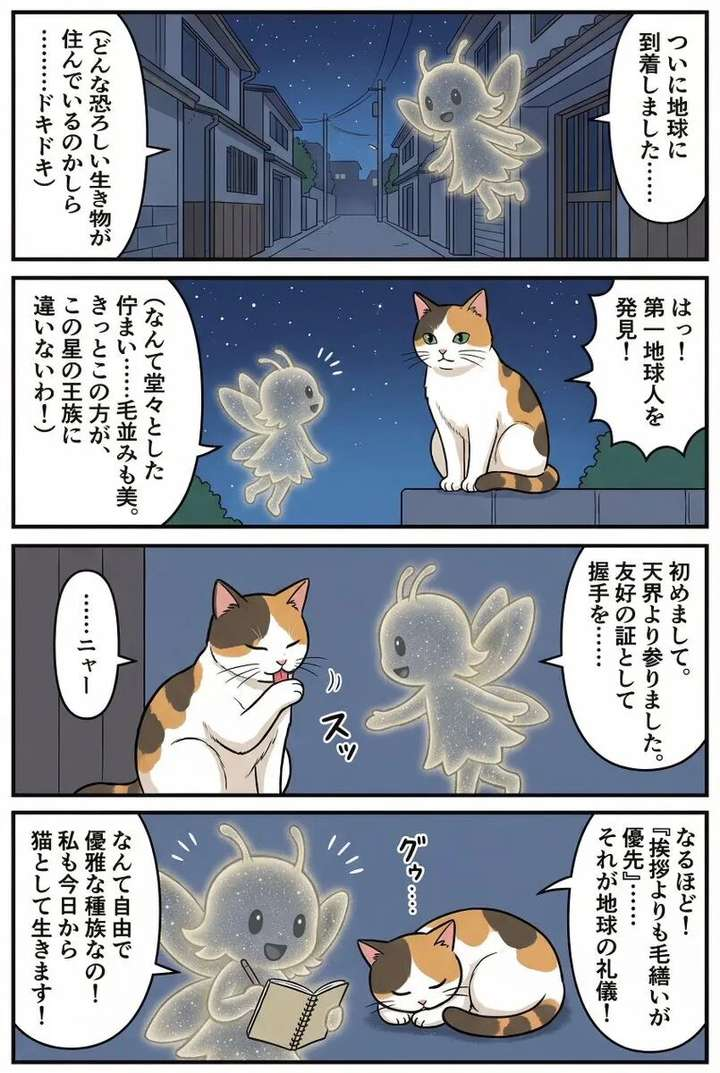 一位仙女从天而降来到地球。她遇到的第一件事物是一只三色猫,于是她认为这个星球是猫的星球,并画了一幅四格漫画,讲述她和猫对话的故事。