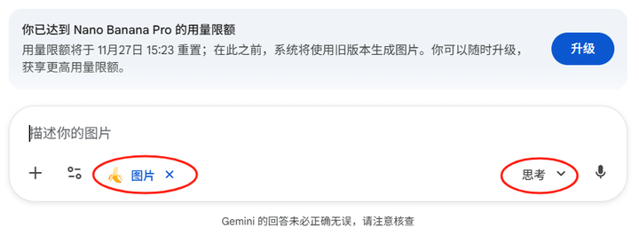 免费限制:免费用戶享有一定的体验额度,但有每日生成张数的限制。免费额度用尽后,系统会自动降级到标准版的 Nano Banana 模型。
