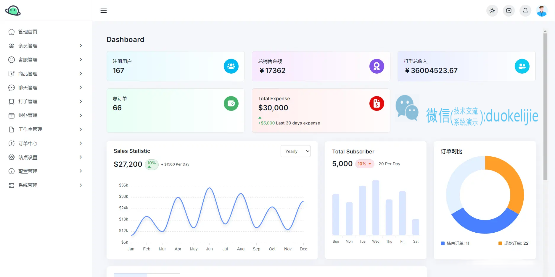 3.后台管理直观: 清晰的后台面板让订单管理、财务统计、用户维护一目了然