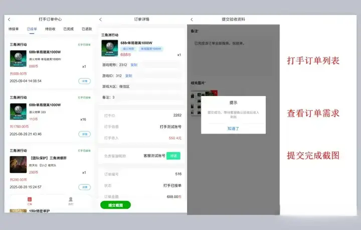 - 拥有出色的游戏技术却苦于接单不稳定?系统为你提供稳定的订单来源,通过技能认证后,平台会根据你的专长和空闲时间自动匹配适合的订单。积累信誉分后,更可获得优先推荐和溢价空间,真正实现技能变现。