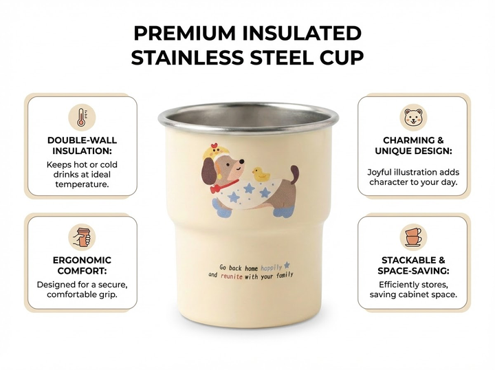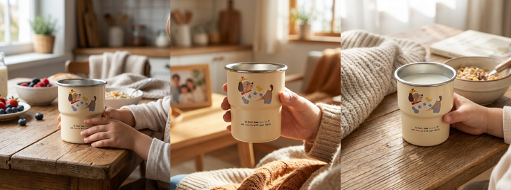 在原图的基础上,保留杯子主体,日系清新风,中景聚焦温馨居家桌面。木质桌面上,米白色针织餐垫摆放杯子,旁有复古胶片相机、白色花瓶(插尤加利叶)、米色信封,背景是米色纱帘。暖色调,木棕、米白、灰绿为主,质感治愈精致,光影柔和明亮;营造日系居家静物摄影氛围。