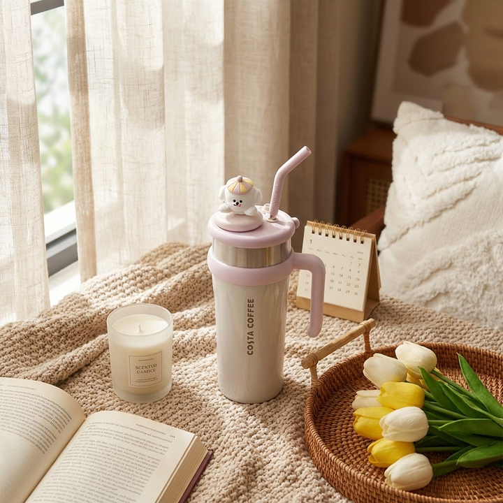 在原图的基础上,保留杯子主体,将背景换成日系小清新风格和ins好物分享风格,采用柔和的自然光(模拟大窗户日式亚麻纱帘侧光),构图采用经典小红书45度俯拍视角或平视特写。米棕色针织毛毯上,错落摆放磨砂玻璃香薰蜡烛,书籍、木质日历、编织托盘盛着白色与米黄色郁金香,旁有白色抱枕。暖色调,以米棕、奶油白为主,质感细腻,充满生活仪式感,背景柔和弱化,突出主体物品层次与细节,文字元素清晰自然,让画面丰富一些,具备生活感气息,但也不能杂乱,高光柔和,阴影干净有空气感。不要生硬得像广告片,风格:高级、精致生活、真实分享感。