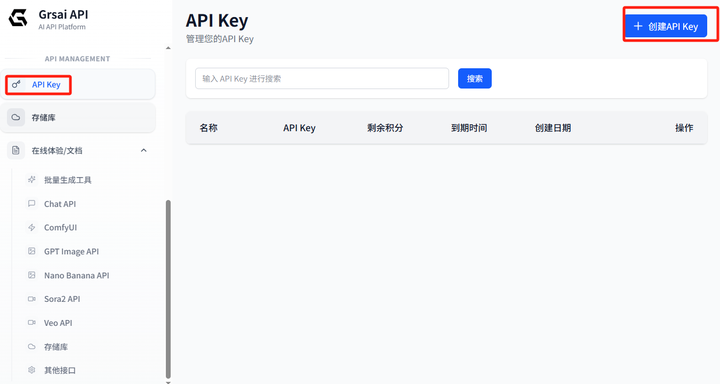 - 访问Grsai:grsai.com/zh/dashboard/api-keys (com域名需要魔法才可访问,没有魔法改成.ai即可)