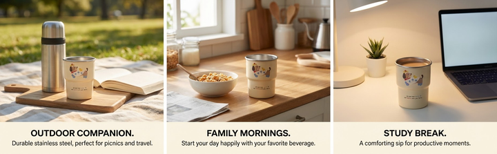 Based on the product in the reference image, generate a lifestyle/usage scenario module image for an Amazon A+ page. Place 3-4 high-resolution, realistic lifestyle photos horizontally side-by-side (uniform size, consistent spacing, borderless or very thin borders). Each photo showcases the product in its natural state in different everyday/outdoor scenarios, with the product fully integrated into the environment and lighting (placed appropriately, seamlessly blending with the background, and with natural and consistent shadows/reflections, avoiding stiff placement or a post-processed look). Below each photo, or lightly overlay a minimalist English selling point title and a short descriptive text (naturally generated based on the product's actual function and usage context, with functional technical details and a slight connection to the scene, and minimal text overall). The overall color scheme should be warm and natural, with perfectly consistent lighting. The layout should be minimalist, clean, symmetrical, and balanced, with a pure white or light-colored background transition. High-resolution professional e-commerce page design, without overlapping cropping or unnecessary decorations, creating a relaxed, realistic, and immersive atmosphere.