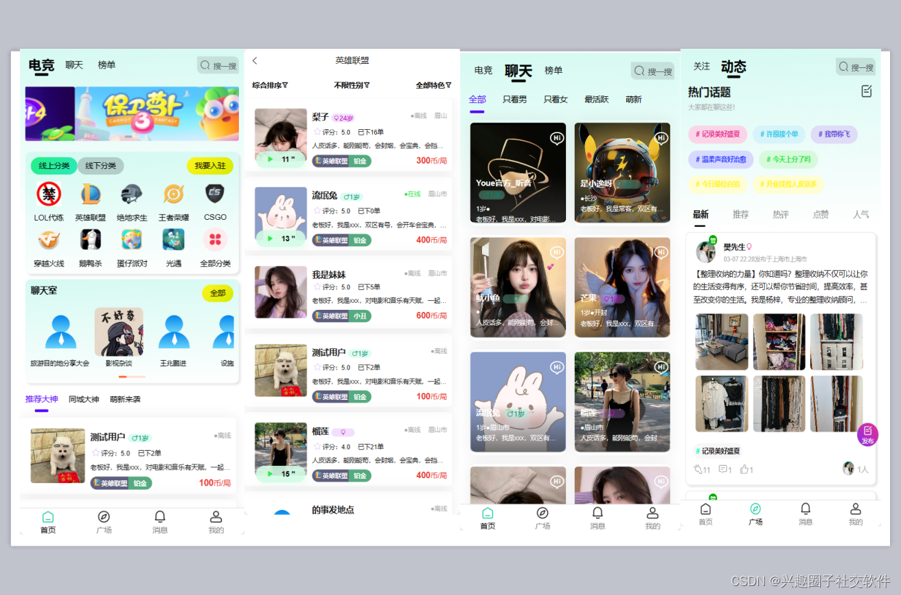 特色功能:动态社区(用户/陪玩师发布图文、短视频)、货币与任务系统(签到、邀请好友获取金币)、附近功能(基于LBS查找附近陪玩师)。