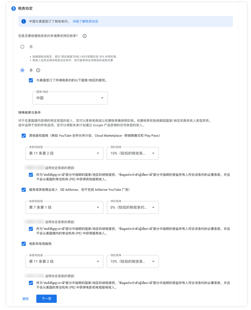 其他版权版税(Youtube 合作伙伴计划):预扣税率选择“10%”。