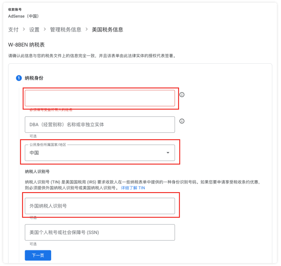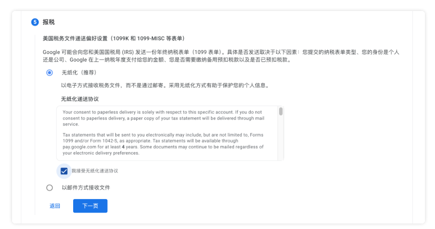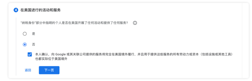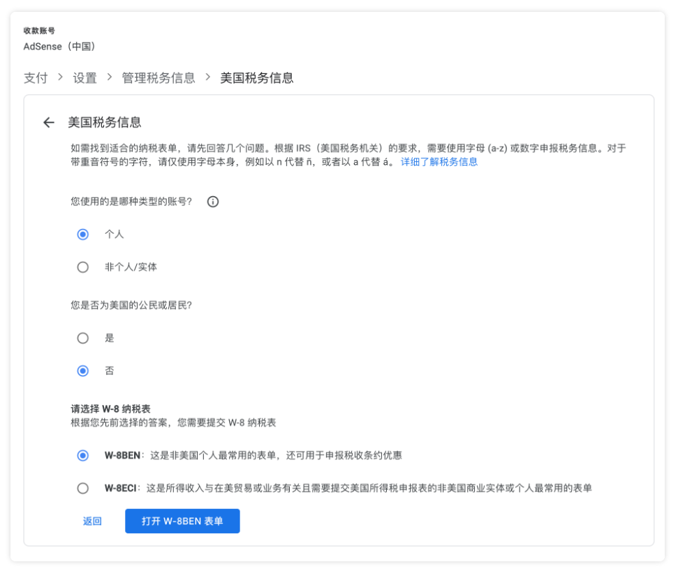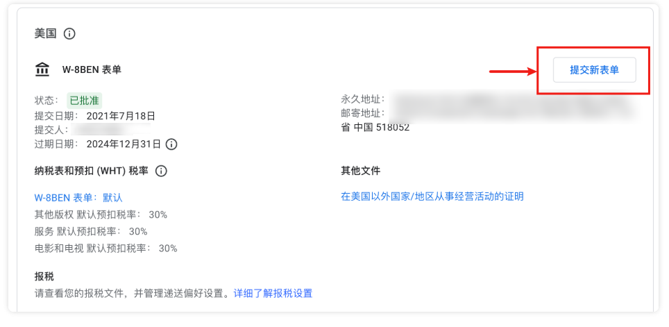 服务或其他商业收入(AdSense):预扣税率选择“0%”。