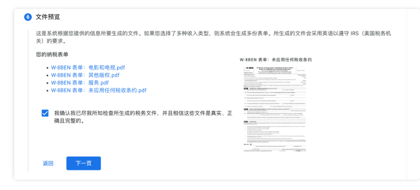 全部填写完成后,会显示纳税表单预览图,点击下一页。