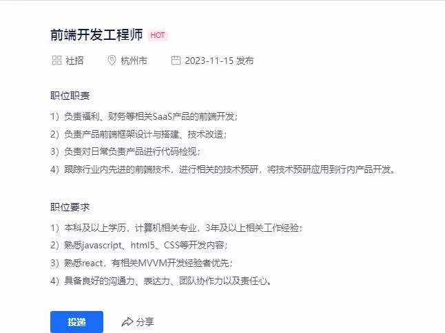 坐标杭州的招银网络招聘前端开发,感兴趣的朋友快来。 前端理想哥2023-11-16 18:03 830 内推微信(添加时请备注:solo):qianduanlixiangge 人才招募#前端#前端招聘1浏览 (830) 充电 (1) 收藏